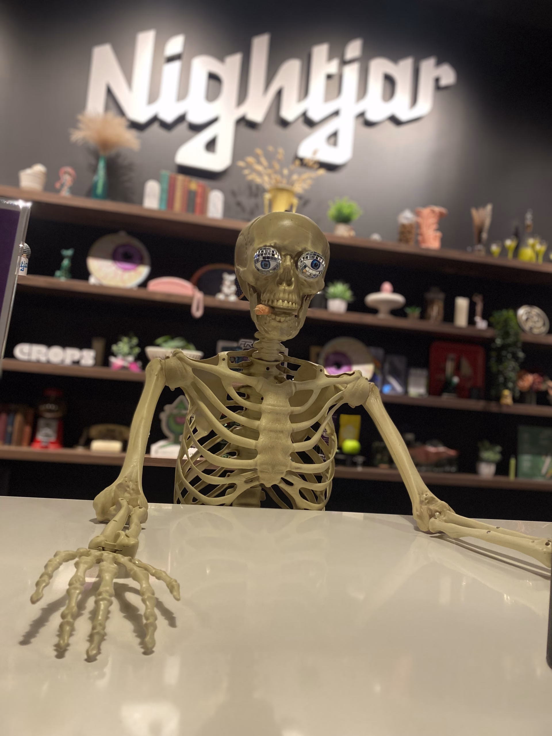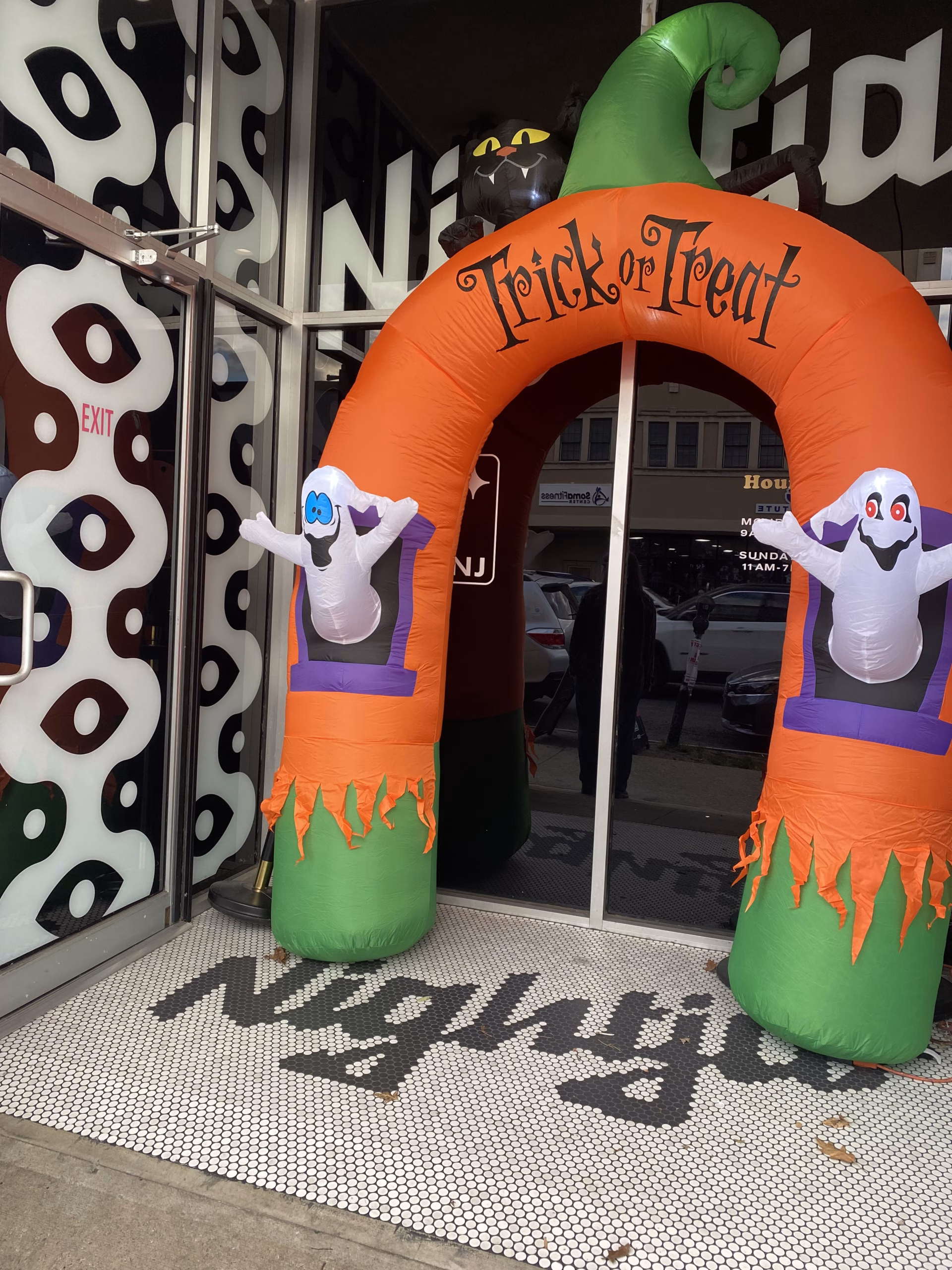 We were blessed with a Friday Halloween this year, and our Bloomfield team turned 549 Bloomfield Ave into a space that felt half-cartoon fever dream and half-haunted lounge. Cobwebs stretched across the counters, ghosts flew from the ceiling, skeletons with disco-ball eyes manned the registers, and an enormous orange “Trick or Treat” blow-up archway greeted customers at the door…and luckily DID NOT blow away during the 50 mph wind gusts!